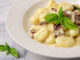 Izvadite iz pećnice, pustite da odstoji deset minuta, a zatim okrenite na tanjure, prelijte sa jedne strane sa preljevom od crvenog luka i poslužite.