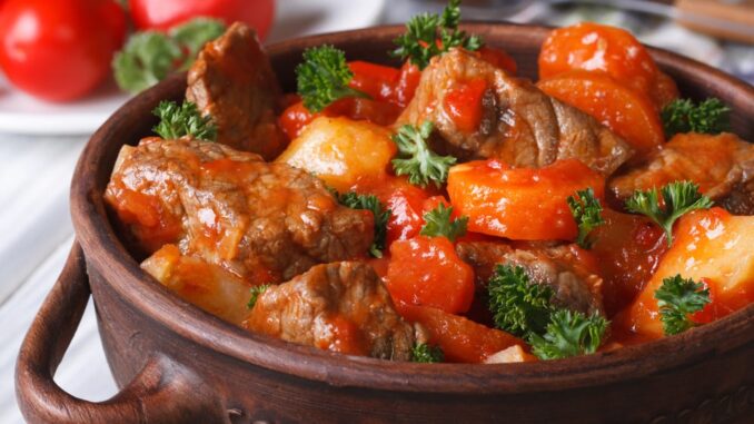 - U šerpi zagrijte ulje, ubacite sitno nasjeckan bijeli luk, miješajte dok ne porumeni, zatim dodajte meso koje ste isjekli na kockice. Pržite par minuta na jakoj vatri, zatim smanjite toplotni izvor, dodajte isječen paradajz, poklopite i pustite da kuha cirka pola sata uz povremeno miješanje. Na kraju dodajte so i ljutu papriku.