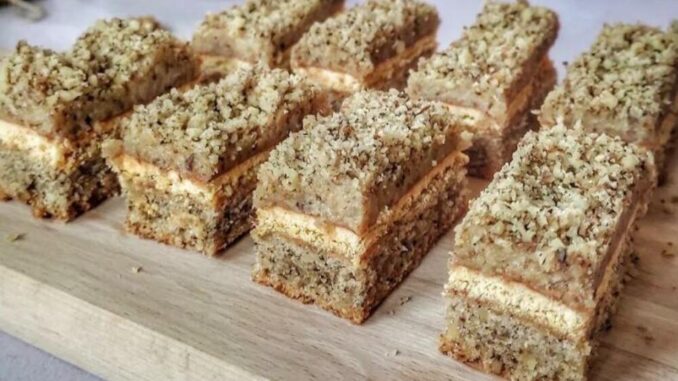 Istucite mikserom margarin, vaniliju i šećer, dodajte isitnjene orahe, zatim uz neprekidno miksanje dodajte jedno po jedno jaje. Nastavite sa miksanjem, dodajte koru i sok od limuna, a na kraju dodajte brašno.